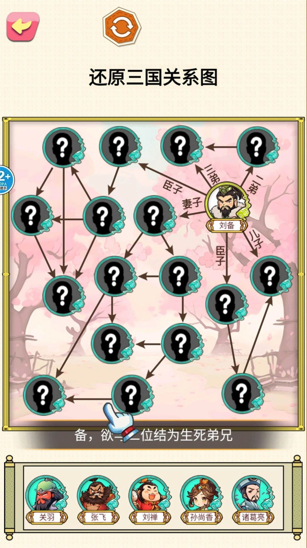 2、游戏将随机生成人物关系图,你需以连线的方式把人物间的关系梳理明晰。