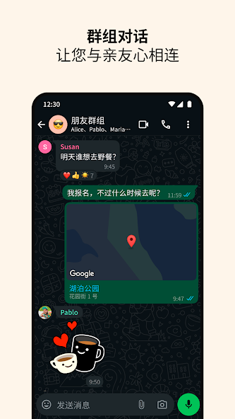 在单人或群组对话中分享个人位置,随时可以取消分享。或录制语音信息,快速联系沟通。