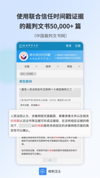 权利卫士取证借助可信时间戳进行固化,从而生成具有不可否认性与不可篡改性的电子证据,为用户打造安全有效的取证服务。该服务荣膺国家版权局与世界知识产权组织共同颁发的中国版权金奖保护奖,且获得司法采信以及行政认可。