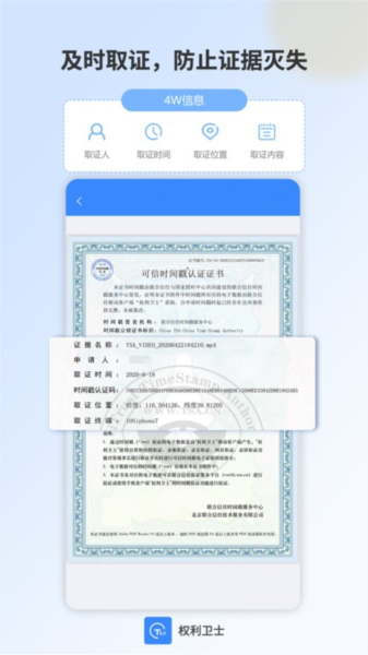 【录像取证】:权利卫士在进行录像取证时,所生成的视频会自动通过可信时间戳进行固化处理,从而形成不可否认且无法篡改的电子证据。