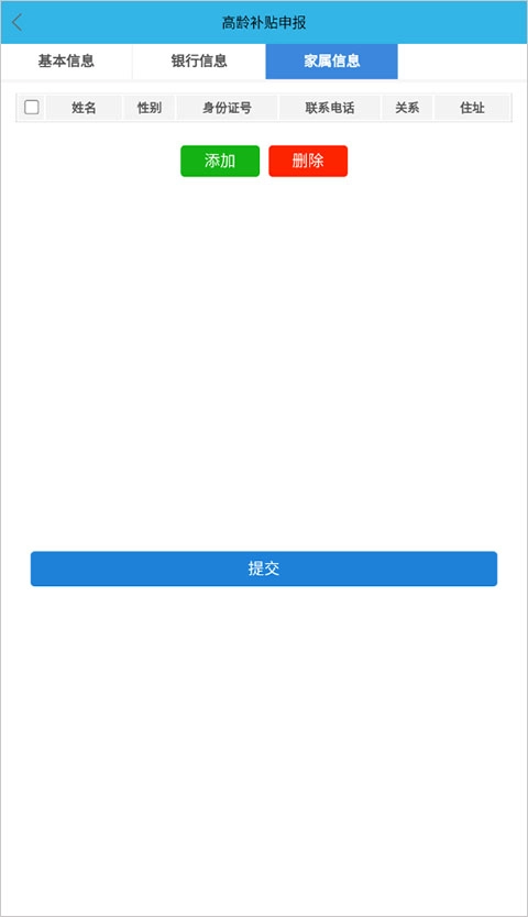 3)补充家属相关信息,具体包括家属姓名、性别、联系电话、与老人的关系以及家庭住址。