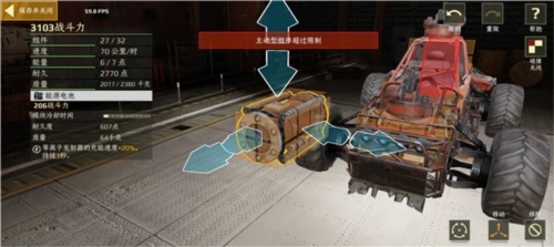 我们配置了自带11点电量的卡车车头,可供战车搭载两门蓝装武器,76毫米火炮打击距离远,威力巨大,火炮的正确使用方法是配备瞄准镜和弹药箱,装备瞄准镜可大幅度提升射击精准度,配备弹药箱可大大提升弹药容量,劣势是火炮冷却时间长,对弹道要求较高,且发射角度有限。