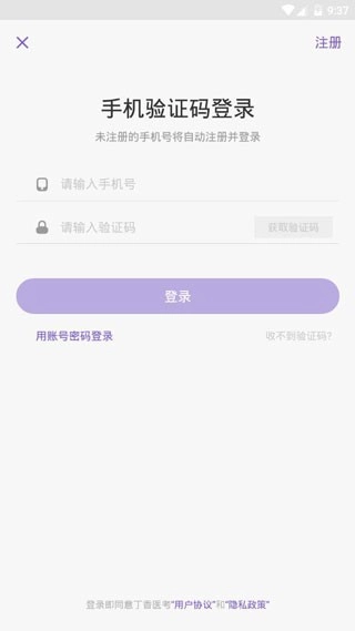 1、打开已经安装好的丁香医考,手机注册登录;