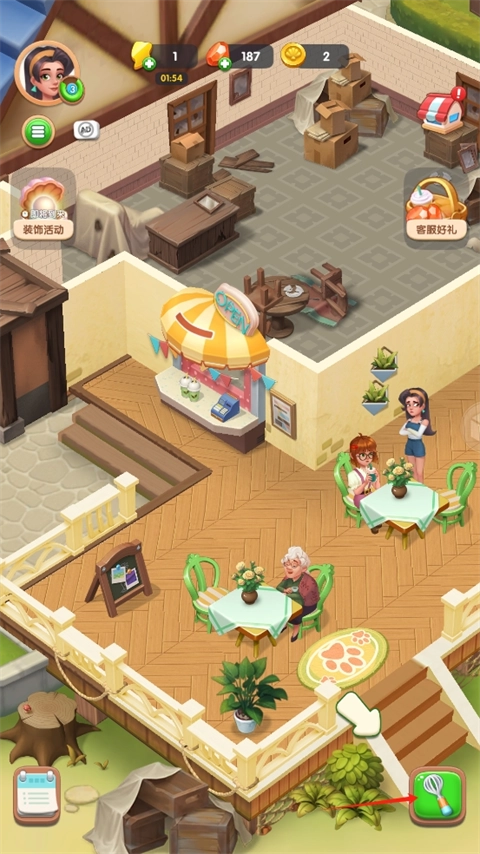 2、依据上方顾客的需求,合成对应的食物。完成右上角的任务后,即可开展装修工作。