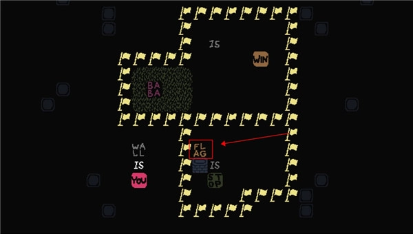 2、后来你能看到有关这个“规则”的各种变种,比如双层地图、用箱子填坑、单纯推出通路等等,场景中“baba is you”、“rock is push”、“flag is win”这些句子其实就是当前关卡的一个规则设定。
