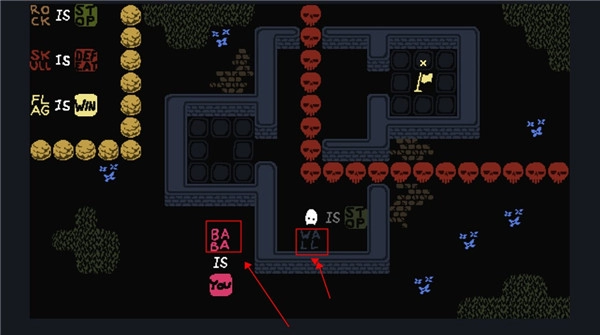 2、这个时候我们控制的就不是baba了,可以控制墙壁,向下滑动用墙壁触碰旗子