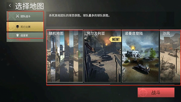 3、能够挑选游戏模式,包含团队战斗、死亡比赛以及皇家战三种模式,随后选择地图,点击战斗。
