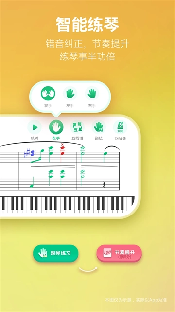 播放乐谱时,页面底部显示对应的钢琴键盘或吉他琴颈,每个音符的对应按键都会在上面亮灯提示,贴心小助手,让你看一眼就会弹琴!