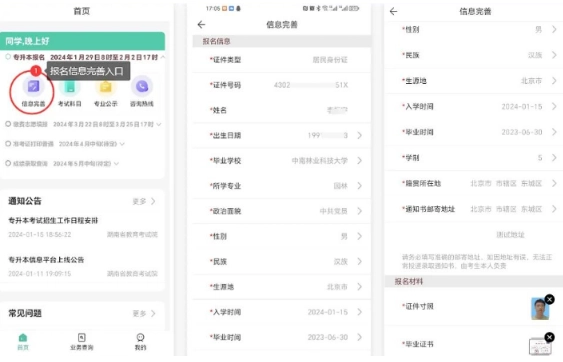 借助潇湘专升本的“信息完善”功能来完善报名信息。对于我省应届毕业生,其个人信息及照片由现就读高校导入,考生务必仔细核对,若个人信息或照片存在错误,需在报名期间与就读高校取得联系并进行修改;往届退役大学生士兵考生则自行在系统中填报以及修改个人信息、照片和毕业证照片。所有考生均需准确填写籍贯所在地、录取通知书邮寄地址信息。