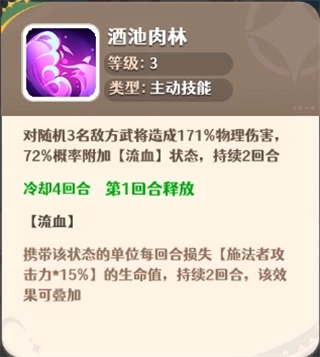 随机对3名敌方武将造成171%的物理伤害,同时有72%的几率附加【流血】状态,该状态持续2回合。