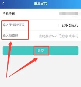4、进入密码重置界面,填入手机验证码与新密码,点击【提交】选项便可完成操作。