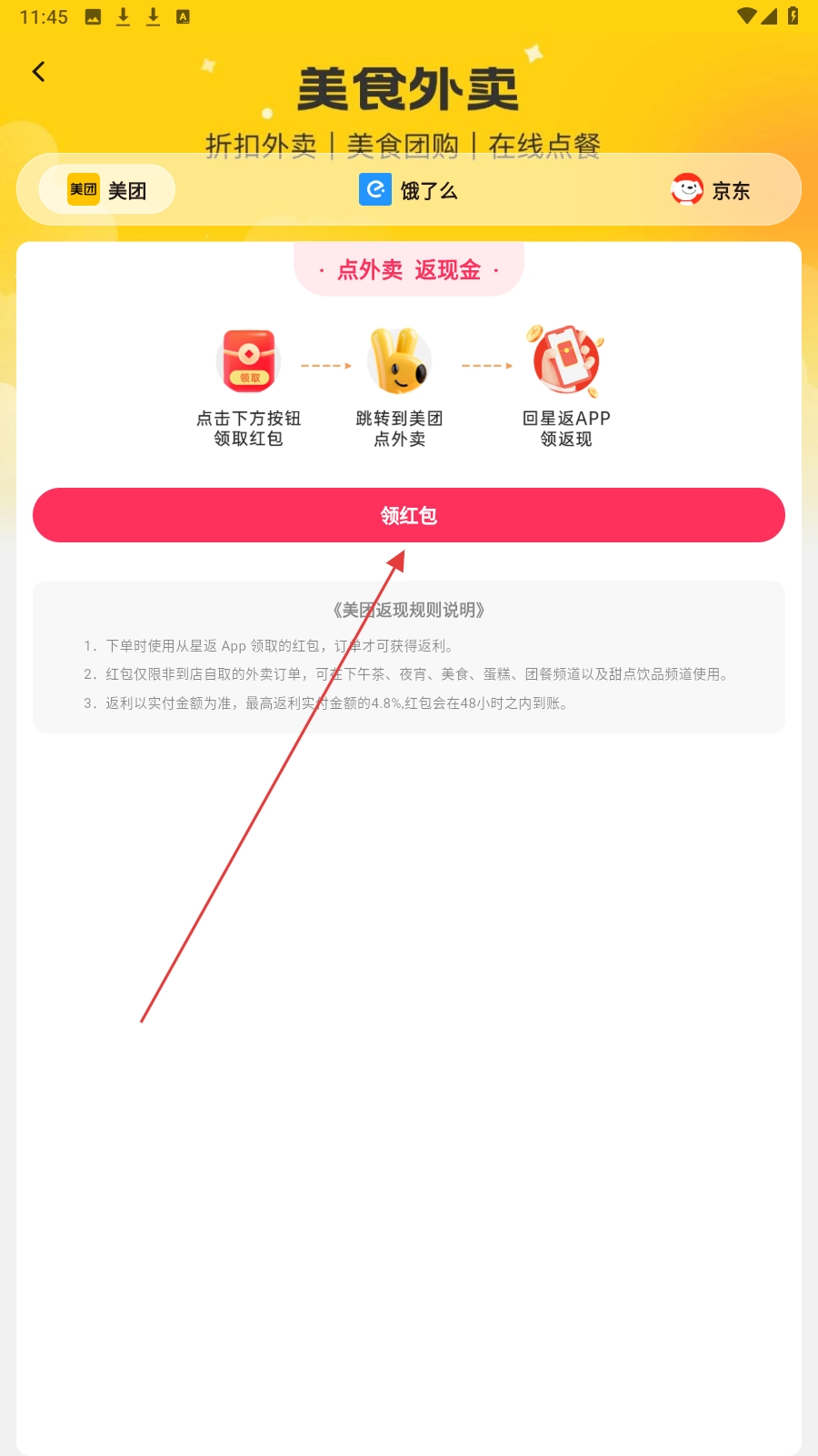 4、于美食外卖页面,点击【领红包】,领取红包后跳转至美团进行外卖下单。