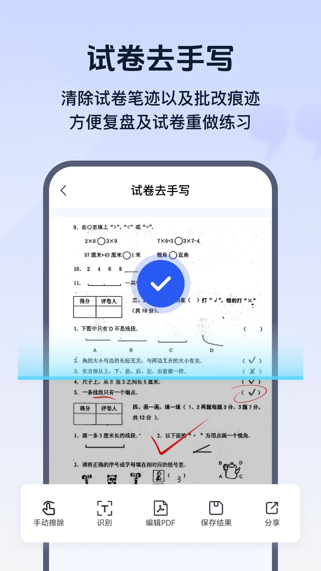 3. 能够自动识别试卷上的手写痕迹并将其擦除,使试卷恢复为一张空白试卷。