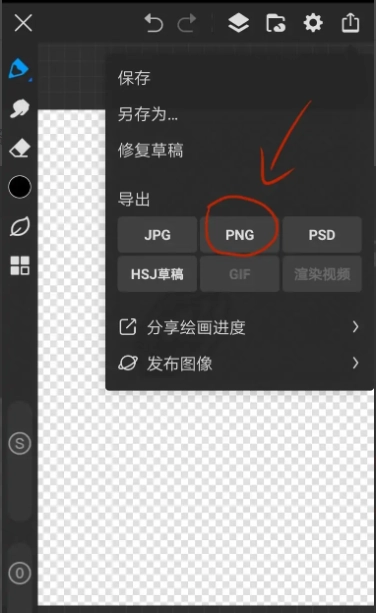 8.这款App支持【JPG】、【PNG】、【PSD】等多种文件格式。若想导出透明底的图片,只需在此处点击【PNG】选项即可。