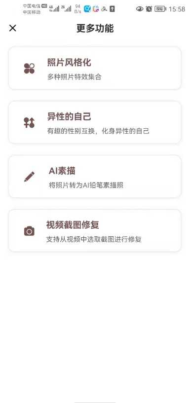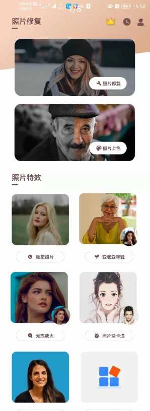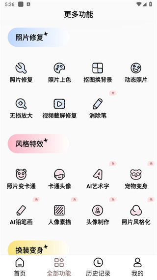 2、全部功能页面分为四大类,分别是照片修复、风格特效、换装变身以及实用工具。