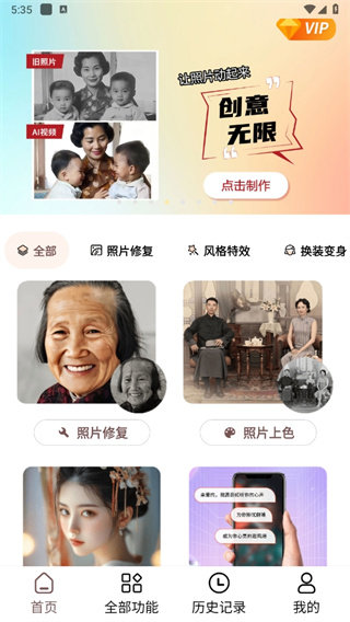 1、开启照片时光机,进入首页后,能看到照片修复、风格特效、换装变身等功能。