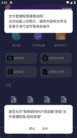 2、以PDF转Word为例,先授予软件所需的手机权限,如图所示。随后选择文件进行转换即可。