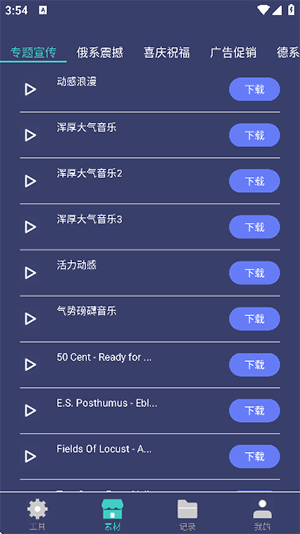 3、其次,软件中提供了更为丰富的音频素材资源,如图所示。其类型十分多元,点击右侧的【】即可获取。