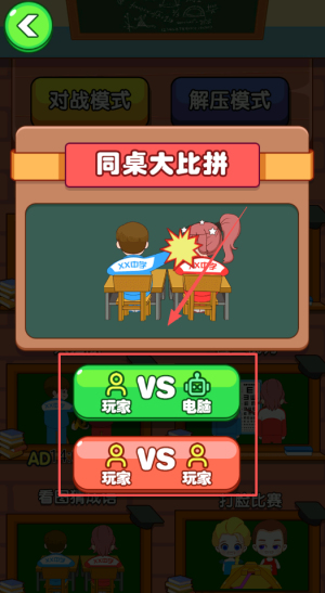 同桌大决斗采用鲜活的卡通动漫画风,再现了满是回忆的课堂场景,还融入了幽默恶搞的玩法精髓。作为一款双人休闲益智游戏,它借助真实的课堂音效(像老师粉笔的敲击声、同学的窃笑声)与极具魔性的操作,营造出诙谐且刺激的对抗体验。