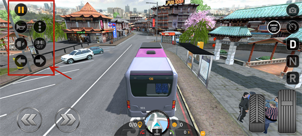 7、进入游戏后就能进行操作啦,小编在图里给各位小伙伴做了简单标注。其中,D是前进挡,也叫驱动挡;N是空挡,在暂时停车的时候(比如遇到红灯)会用到。注意哦,这个挡位代表空挡,为了避免车辆在斜坡上溜车,一定要踩着刹车。R是倒车挡,用于倒车的时候。