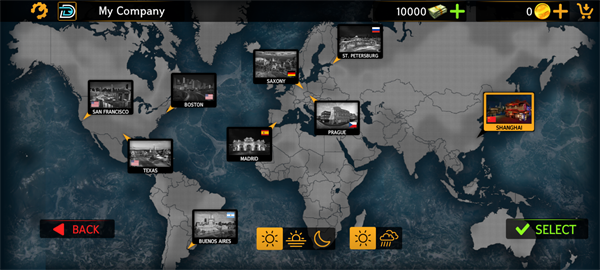 3、挑选你想去的地区,游戏内设有各类基于现实的城内与城外地图,包括美国(旧金山、德克萨斯)、南美洲(布宜诺斯艾利斯)、欧洲(德国、西班牙、布拉格、圣彼得堡)、迪拜、上海等。此外,你还能在下方选择当前地区一天内的多个时段以及不同天气条件,点击“SELECT”即可。