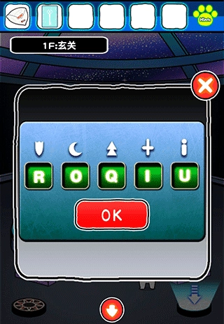 此屏幕与玄关上的图案相互对应,具体为:i~u ,方形~d ,十字架~i ,i~u ,叠三角~q ,五角星~d ,盾~r ,月亮~o ,菱形~m ,铜钱~n 。