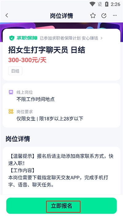 4、点击立即报名,需要注意的是,报名后需要主动添加商家的联系方式,快速入职;