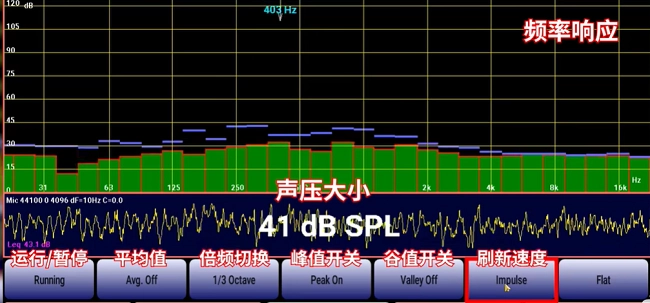 软件界面最上方展示的是当前声音的频率响应情况,中间区域呈现的是声压的具体数值,底部则排列着软件的主要操作按键。