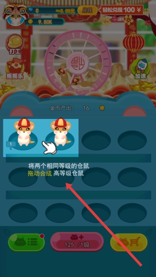 把两个等级相同的仓鼠拖拽到一起(红箭头所指位置)完成合成,这样就能让仓鼠升级,进而提高金币的获取速度啦。