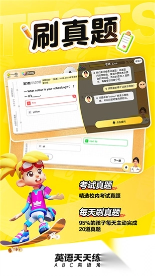 英语天天练的前身是ABC英语角,这是创境领域科技有限公司专门为中小学生开发的一款英语学习应用。它包含了新课标要求的校内同步学习资源,覆盖国内85个版本的英语教材、百万道历年真题,还配备了1对1的老师讲解服务,能够切实帮助孩子们更轻松地掌握英语。