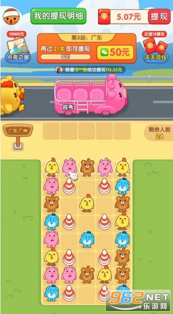目前玩这个游戏通过前两关总共赚了0.36元,其中第一关赚了0.11元,第二关赚了0.25元,这些收益都能顺利提现到账;不过从第三关开始,游戏难度提升了很多。这个游戏的玩法其实很简单,就是点击游戏里的小动物,而且黄色的动物要上黄色的车,等所有动物都成功上车后就能通关了。