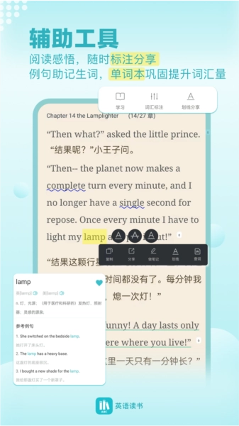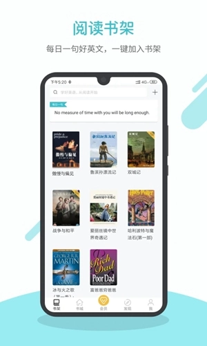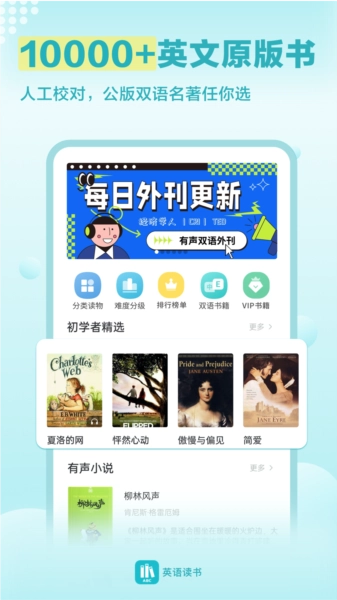 英语读书是一款聚焦英语图书阅读的应用,会为你推荐经典英文读物与英语图书相关资讯,助你在阅读过程中高效积累词汇并掌握其用法。它不只是实用的英语学习工具,更能带你开启一场畅快且深度的文学旅程。告别枯燥乏味,尽情领略英语学习的全新乐趣。