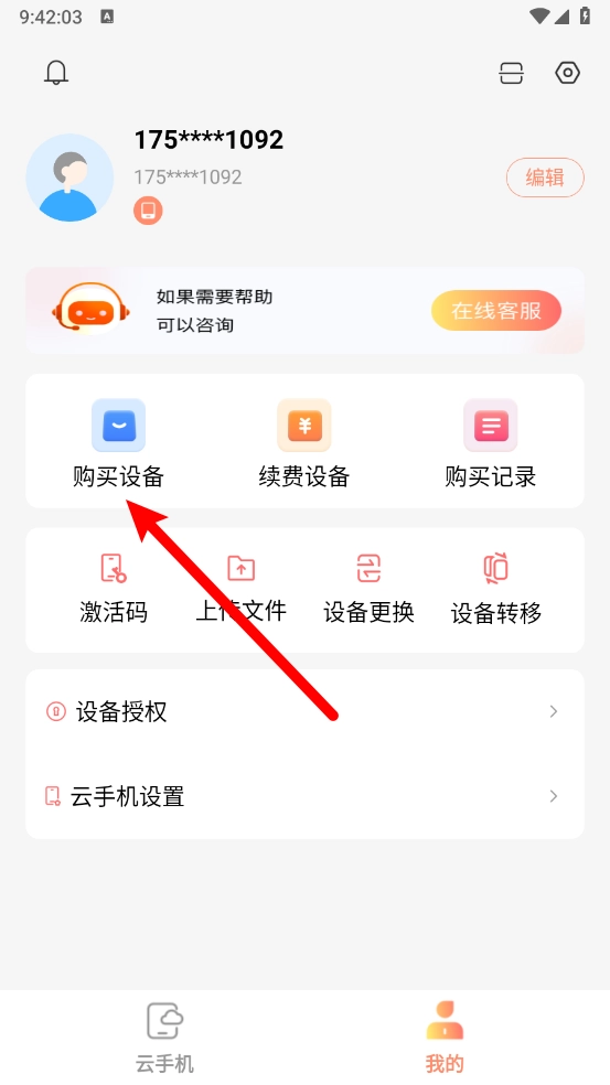 切换至我的页面,点击"购买设备"。
