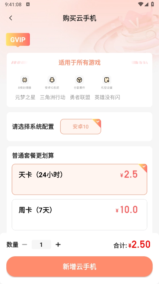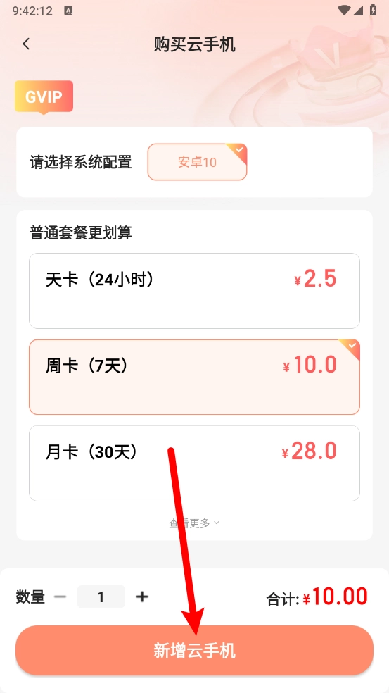 进入后选择所需的套餐,点击"新增云手机"即可。