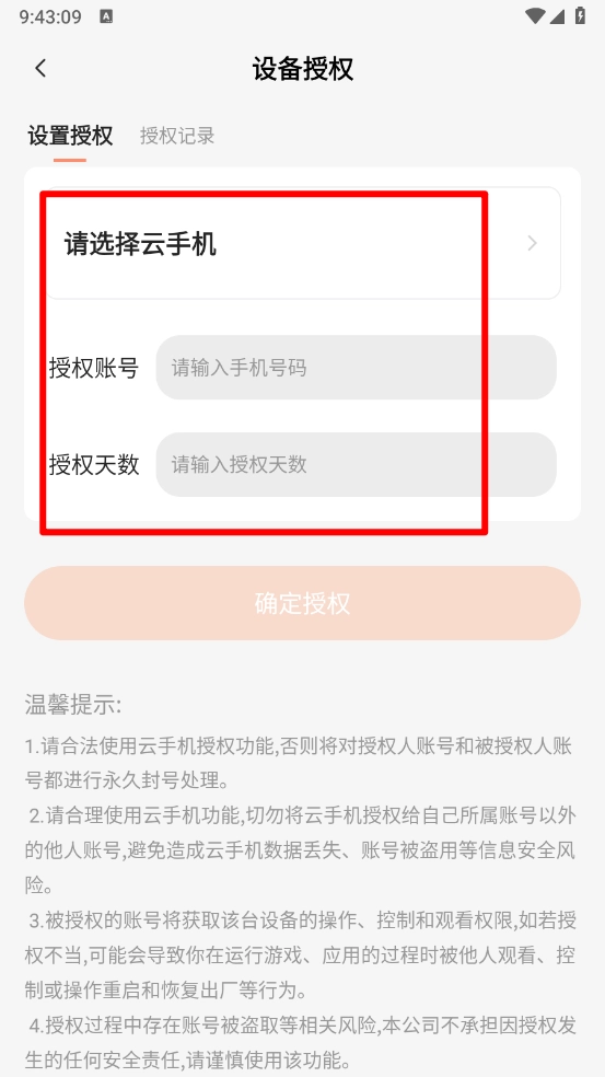 请合法使用云手机授权功能,若有违规,授权人账号与被授权人账号都将被永久封号。