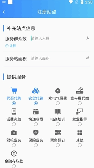 打开智慧乡村服务应用,在应用内找到“站点注册”按钮并点击该按键。