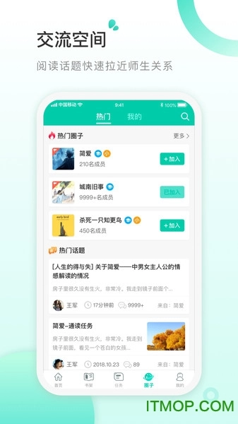可以在圈子里和学生聊天互动,增进师生间的距离,推送更多与阅读相关的知识。