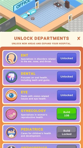 解锁并优化数十种物品,对科室进行升级改造,解锁新的设施设备,以提供最优服务。