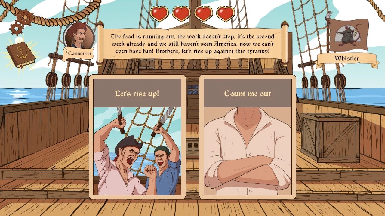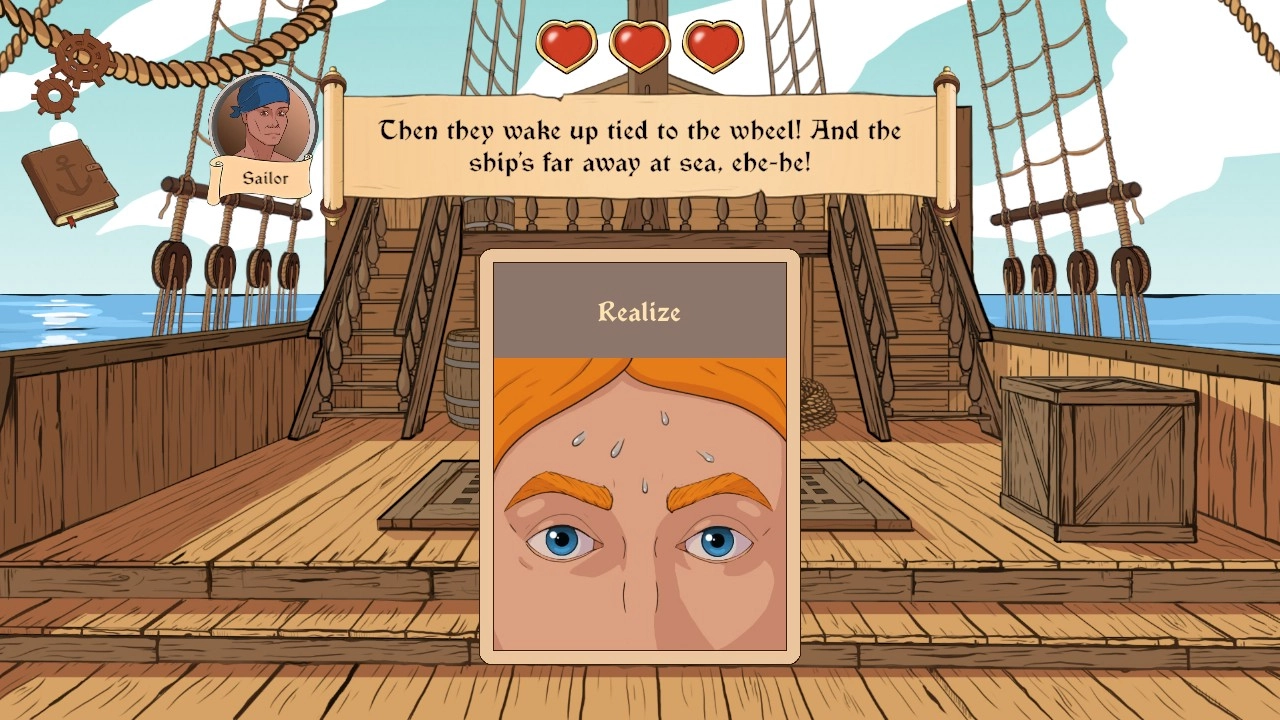 游戏中会遇到船只缺水手却无人应征的状况,此时要在擦洗甲板、倾听并回想昨日发生的事情之间做出选择,以此推动故事发展。