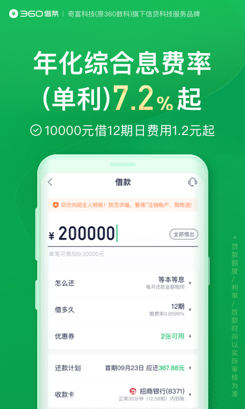 借款1000元可分12期偿还,每日息费最低0.12元起,年化综合息费率(按单利计算)7.2%起,具体息费以最终审核结果为准。