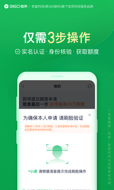 贷款全程线上办理,无需抵押;凭手机号、身份信息等材料就能申请;360借条采用创新“刷脸”识别技术,不用上门,也无需提交纸质材料。