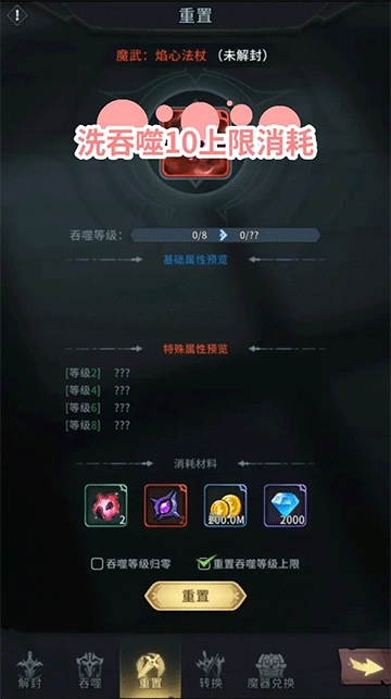拿制作武器来说,洗一次吞噬属性需要消耗2个归元、2个魔器碎片和2000钻石。运气好的话一次就能成功,运气普通大概要7到8次,重点是洗这个属性的过程