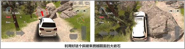 这一关里车辆性能不太好,没办法直接越过巨岩区域。想要通过的话可以按照图示操作:先在图1里找到斜坡,然后借助惯性一口气冲上大岩石就行。