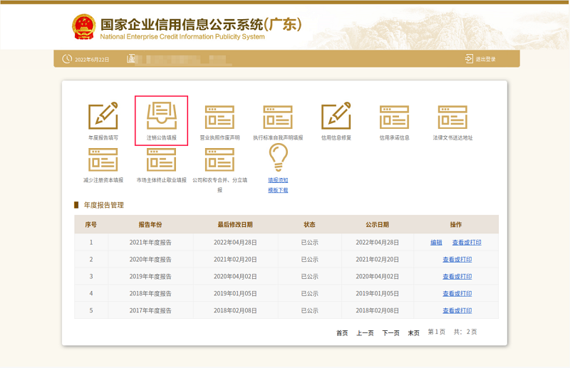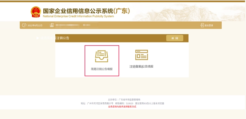 申请人登录首页后,选择“注销公告填报”选项。进入注销公告首页,再点击“简易注销公告填报”,系统便会跳转至简易注销公告的填报页面。