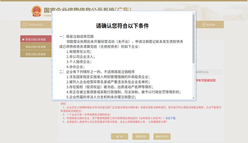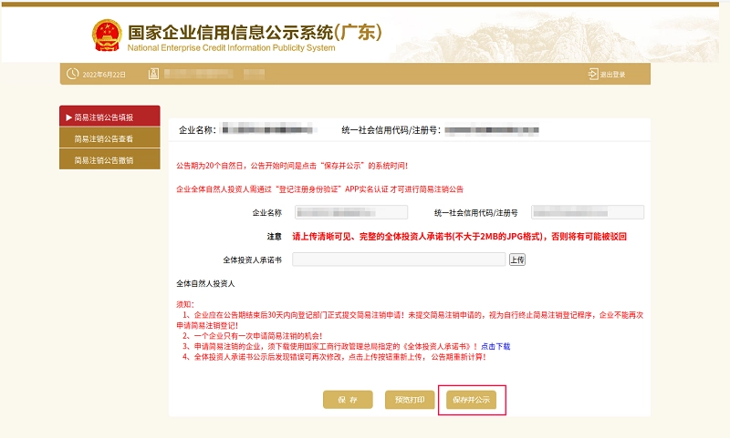 人都已通过实名验证后,点击[保存并公示]按钮,就能完成简易注销公告。