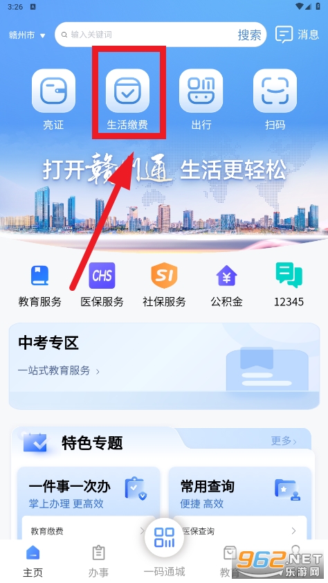 打开赣州通,点击首页-生活缴费