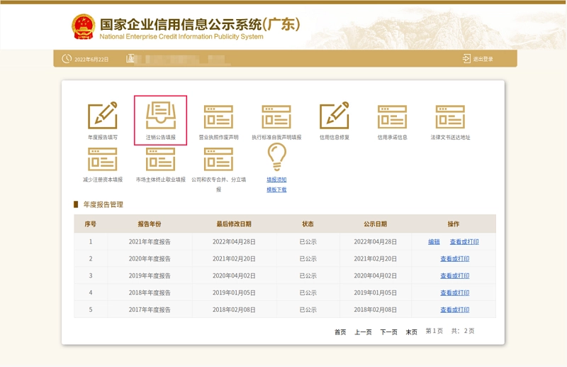 ①在登录首页选择[注销公告填报]