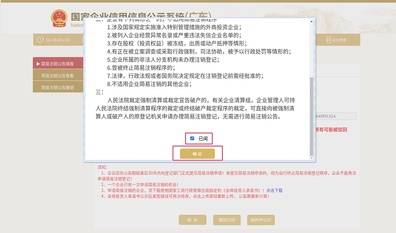 申请人应仔细核实自身是否满足简易注销的条件,若符合相关要求,请勾选[已阅]并点击[确认]按钮。