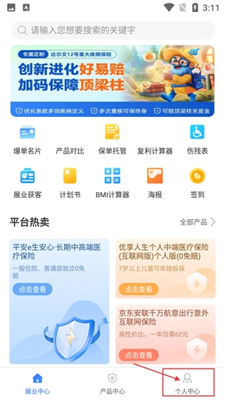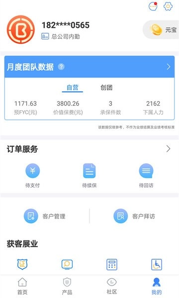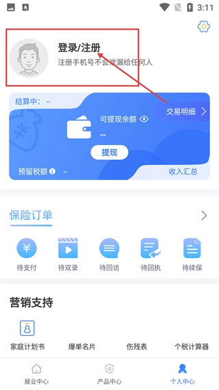在展业中心页面,点击底部的【个人中心】选项,就能进入个人中心界面,该界面包含订单管理、收入结算等功能,同时页面也提供保险产品查询之类的服务。