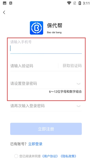 注册页面需按顺序填写【手机号】,接着获取并输入【验证码】,再设置6至12位字母与数字组合的【登录密码】,全部完成后就能提交注册申请。